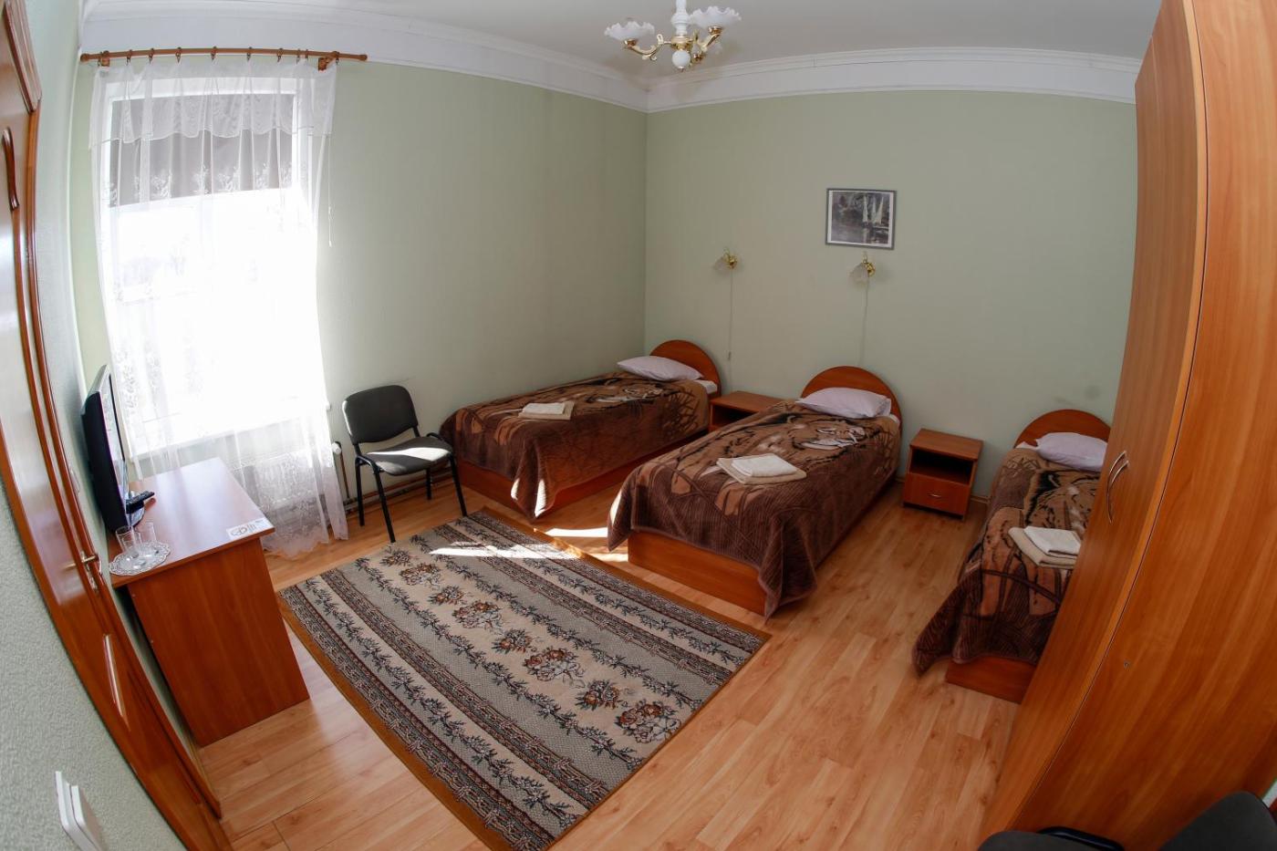 Triple Room. A very spacious and simply furnished room with a fridge, a TV and a bathroom with a shower and free toiletries. ;