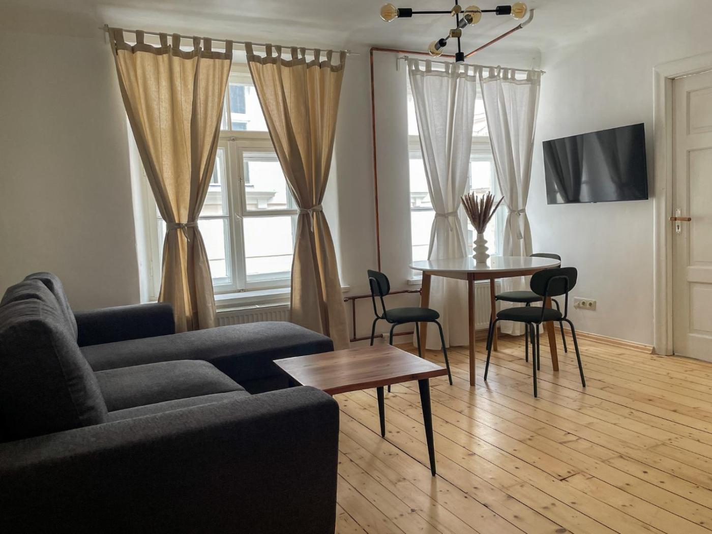 One-Bedroom Apartment. In the fully equipped kitchen, guests will find a stovetop, a refrigerator, kitchenware and an electric kettle. The apartment features parquet floors, a seating area with a flat-screen TV, a dining area, heating as well as a quiet street view. The unit offers 2 beds. ;